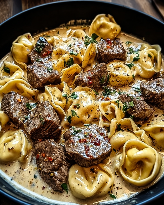 A delightful dish combining rich flavors and comforting textures with tender steak, cheesy tortellini, and a luscious creamy sauce.