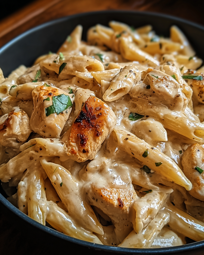 Now it’s time to bring everything together! Return the cooked chicken to the skillet and add the drained pasta. Toss everything together until well combined. This is where the magic happens! The pasta will soak up the creamy sauce, making each bite delicious. Season with salt and pepper to taste, adjusting as needed.