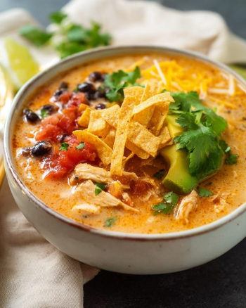 A comforting and flavorful soup made with tender chicken, hearty beans, vibrant vegetables, and a creamy base topped with crispy tortilla strips.