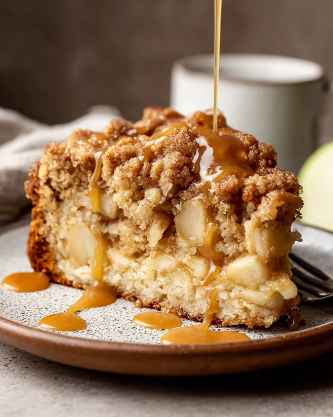 Heavenly Apple Crumble Cake is warm, drizzled with the cinnamon glaze. You can also add a scoop of vanilla ice cream or a dollop of whipped cream for an extra treat. Pairing it with fresh fruit or a drizzle of caramel sauce can elevate the experience even more. Enjoy it as a dessert or a sweet breakfast treat!