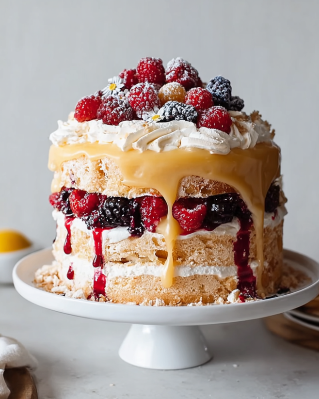 A refreshing two-layer cake featuring coconut and lemon zest in the batter, layered with homemade tart lemon curd and fresh mixed berries, and topped with a fluffy, toasted meringue.
