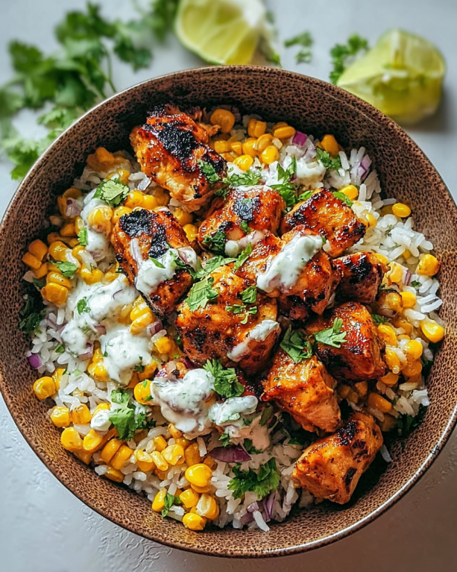 - Assemble the bowl with a base of rice, topped with sliced chicken, charred corn, and creamy sauce. Add sliced avocado and serve with lime wedges.
