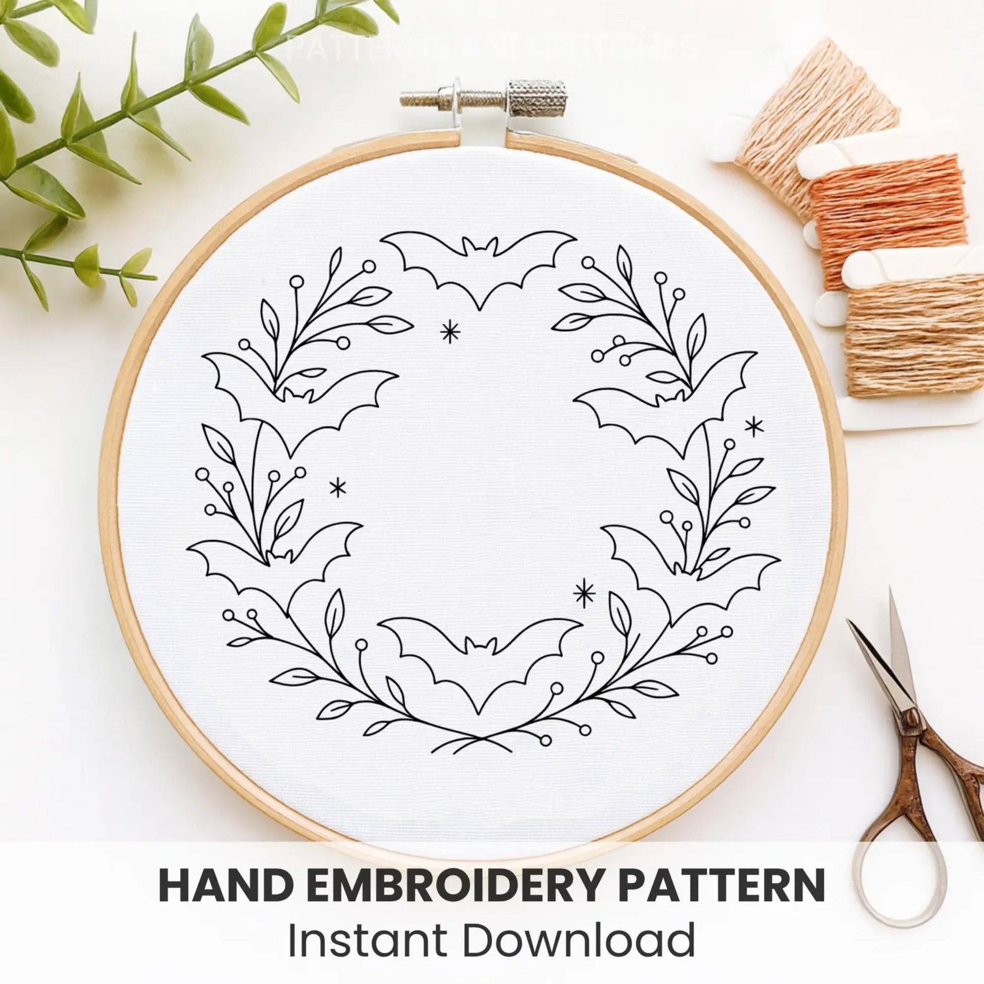 Bats Wreath Hand Embroidery Pattern: Halloween Witchy Design (PDF Pattern)