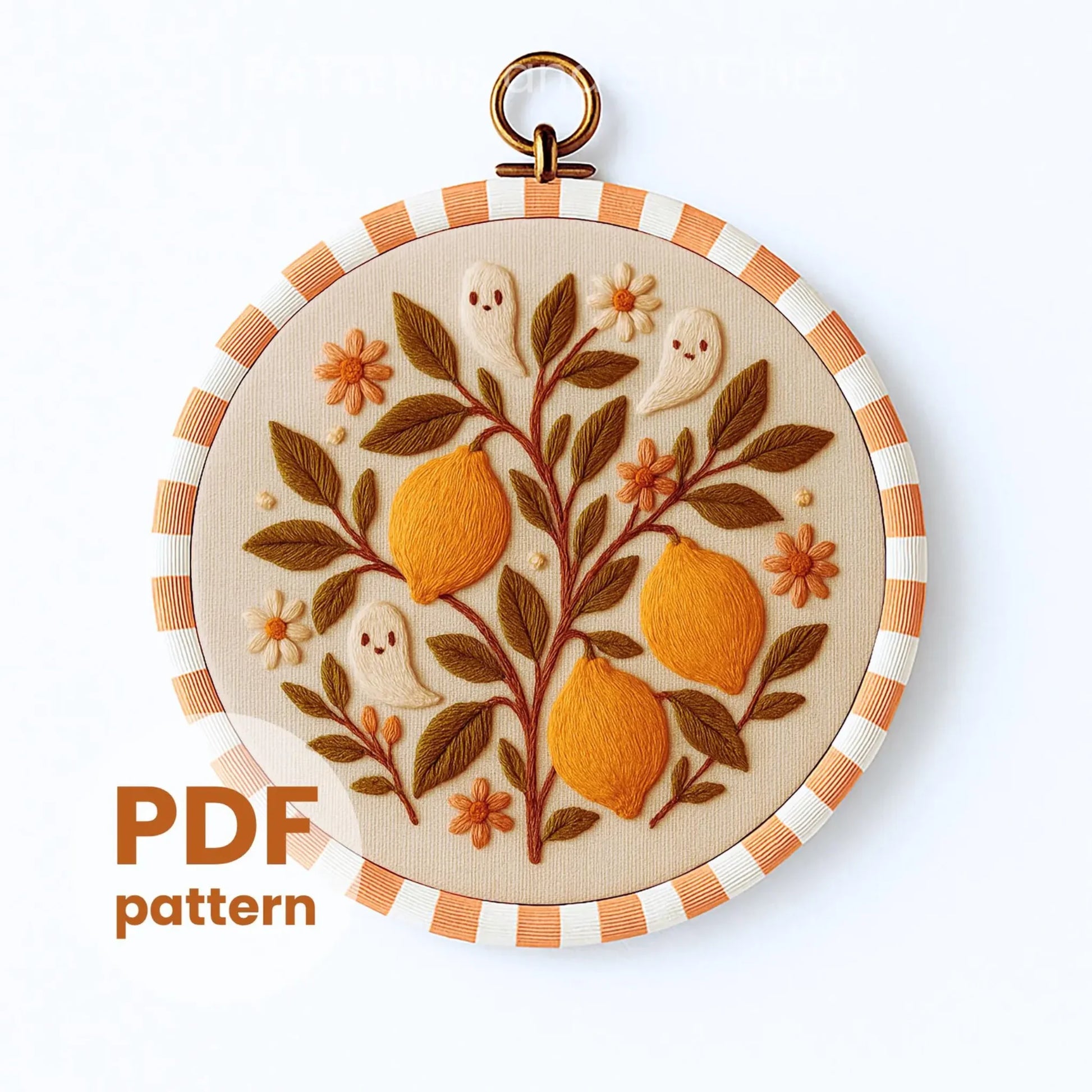 Lemon Branch Embroidery Pattern with Ghosts: Citrus Floral Design (PDF Download