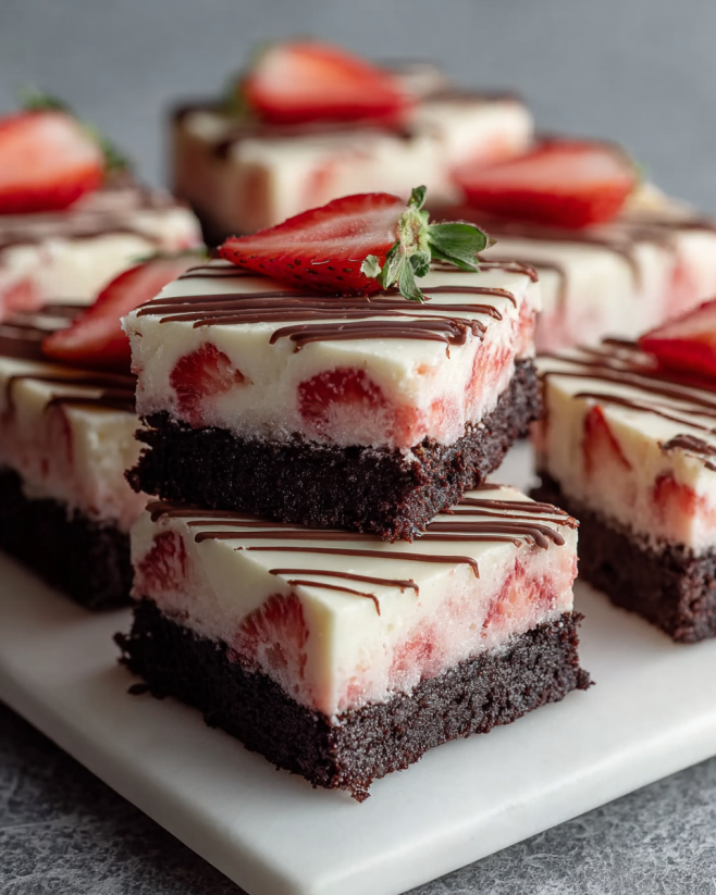 In conclusion, Strawberry Cheesecake Bars with Brownie Crust are a delightful dessert that brings together the best of both worlds: rich chocolate and creamy cheesecake. This recipe is not only easy to follow but also allows for creativity with variations and toppings. Whether you’re preparing them for a special occasion or just a sweet treat for yourself, these bars are sure to impress.